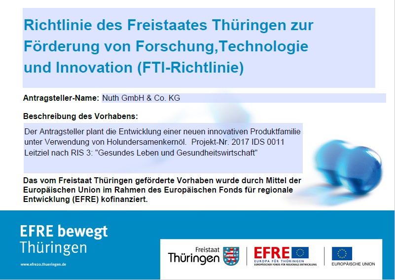 Die Firma Nuth GmbH & Co. KG plant die Entwicklung einer neuen innovativen Produktfamilie unter Verwendung von Holundersamenkernöl. Grundlage dafür sind sowohl der wissenschaftliche Nachweis der Unbedenklichkeit bei Anwendungen auf der menschlichen Haut als auch die möglich positiven dermatologischen Eigenschaften. Das Vorhaben wird finanziell durch die Thüringer Aufbaubank unterstützt.